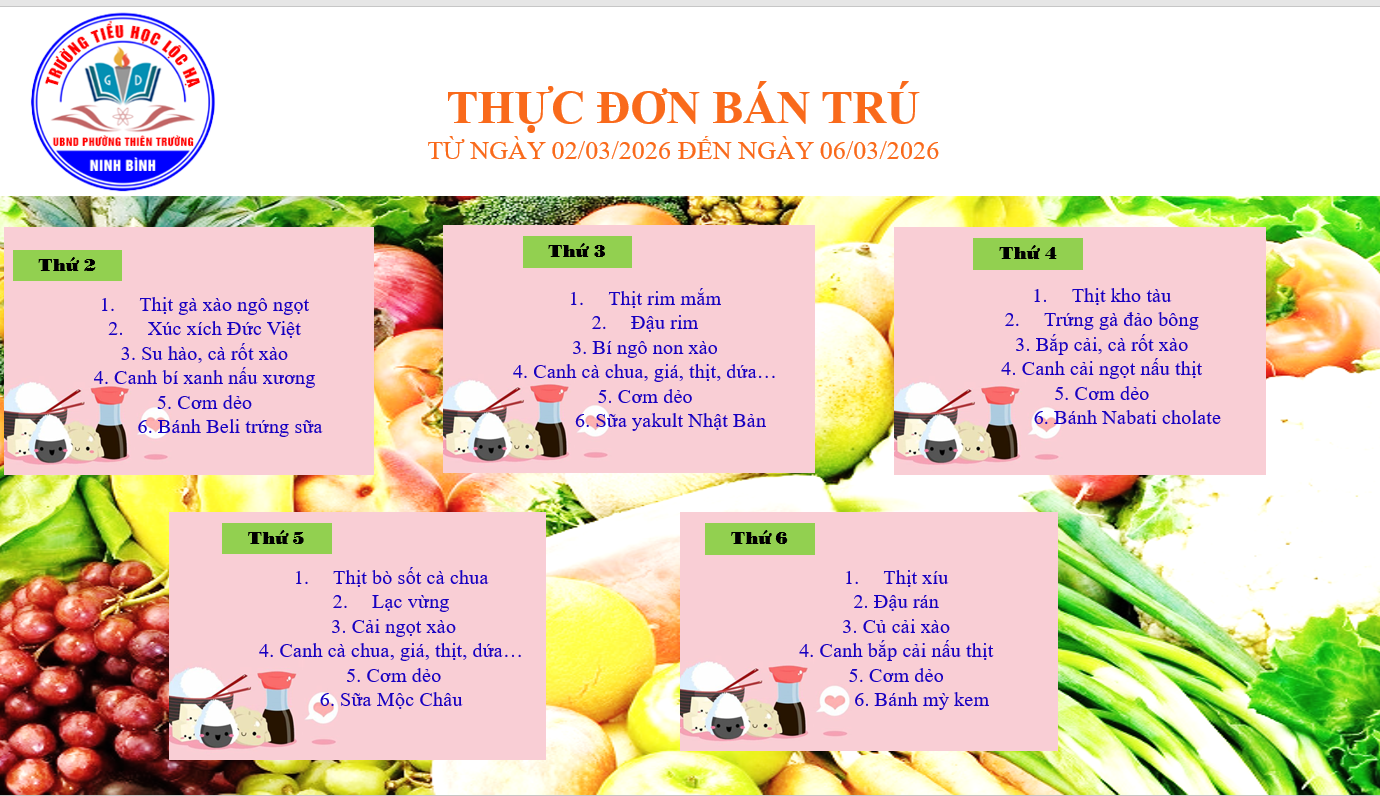 Thực đơn bán trú từ ngày 02/03/2026 đến ngày 06/03/2026