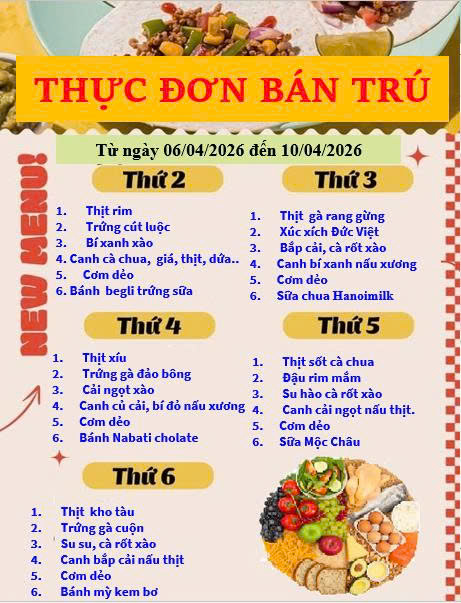 Thực đơn bán trú từ ngày 06/04/2026 đến 10/04/2026