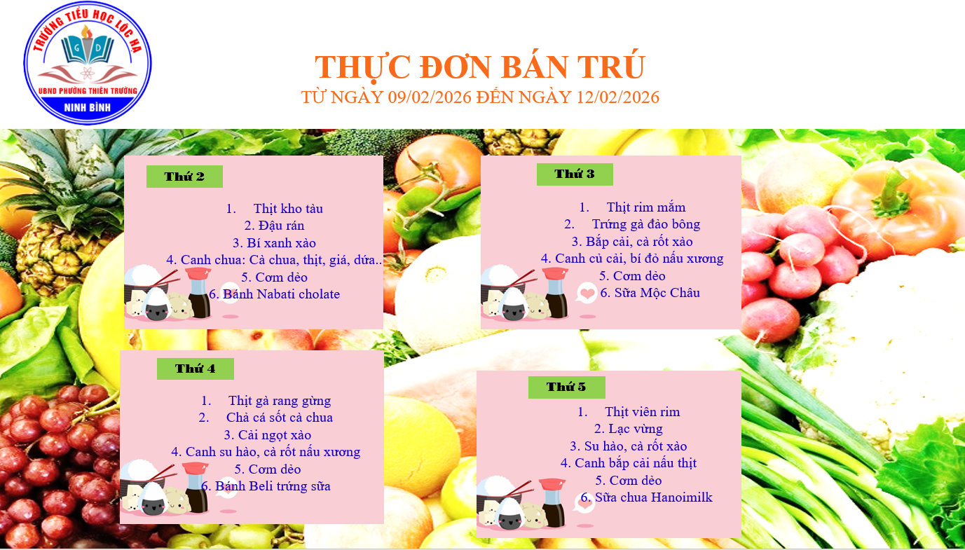 Thực đơn bán trú từ ngày 09/02/2026 đến ngày 12/02/2026