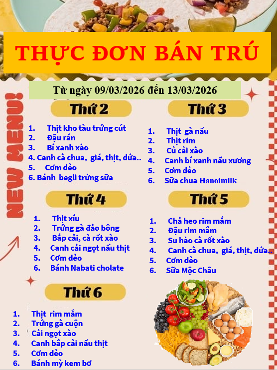 Thực đơn bán trú từ ngày 09/03/2026 đến ngày 13/03/2026